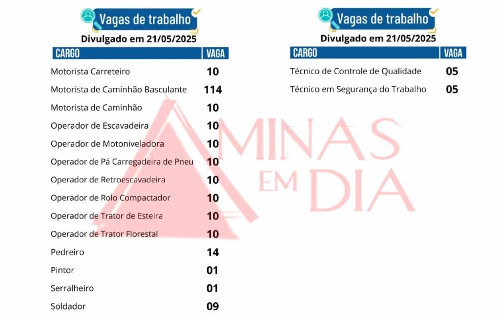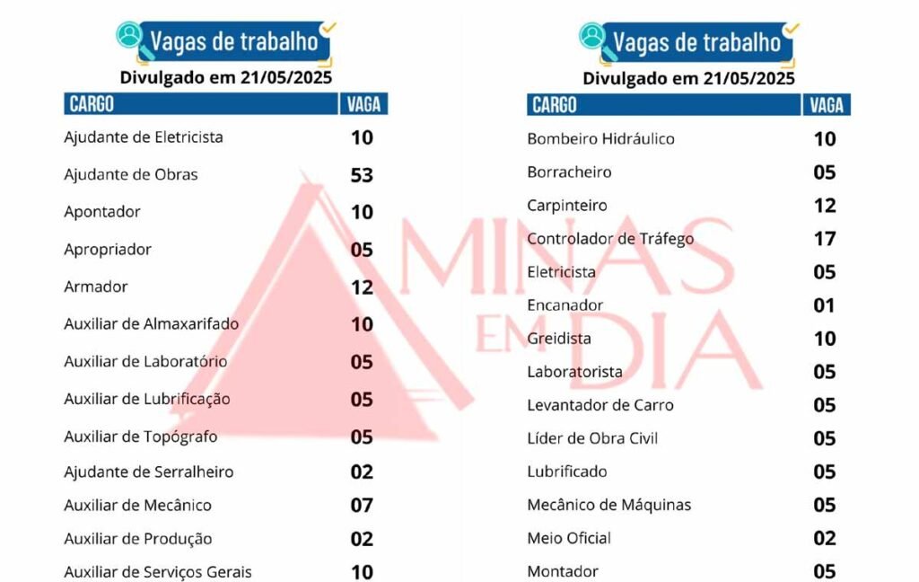 As vagas abrangem setores como construção civil, transporte, manutenção, segurança do trabalho, entre outros. Há posições tanto para profissionais com experiência quanto para quem busca o primeiro emprego.