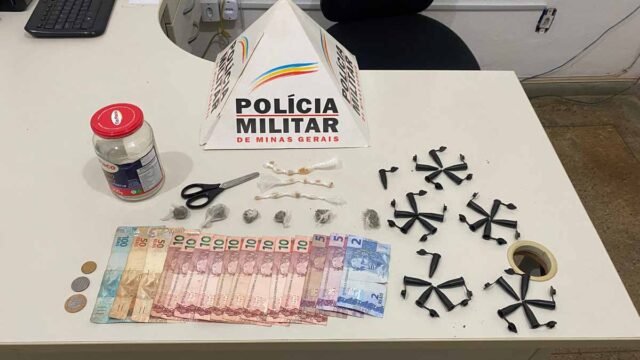 Diante da suspeita, os militares abordaram o rapaz e, durante a busca pessoal, localizaram diversos materiais relacionados ao tráfico, incluindo drogas, dinheiro e utensílios com vestígios de entorpecentes. De acordo com a ocorrência, foram apreendidos cerca de 12 pedras de crack, 6 buchas de maconha, R$ 303,60 em dinheiro, 26 pinos vazios, usados para embalar cocaína e 1 tesoura com resquícios de maconha