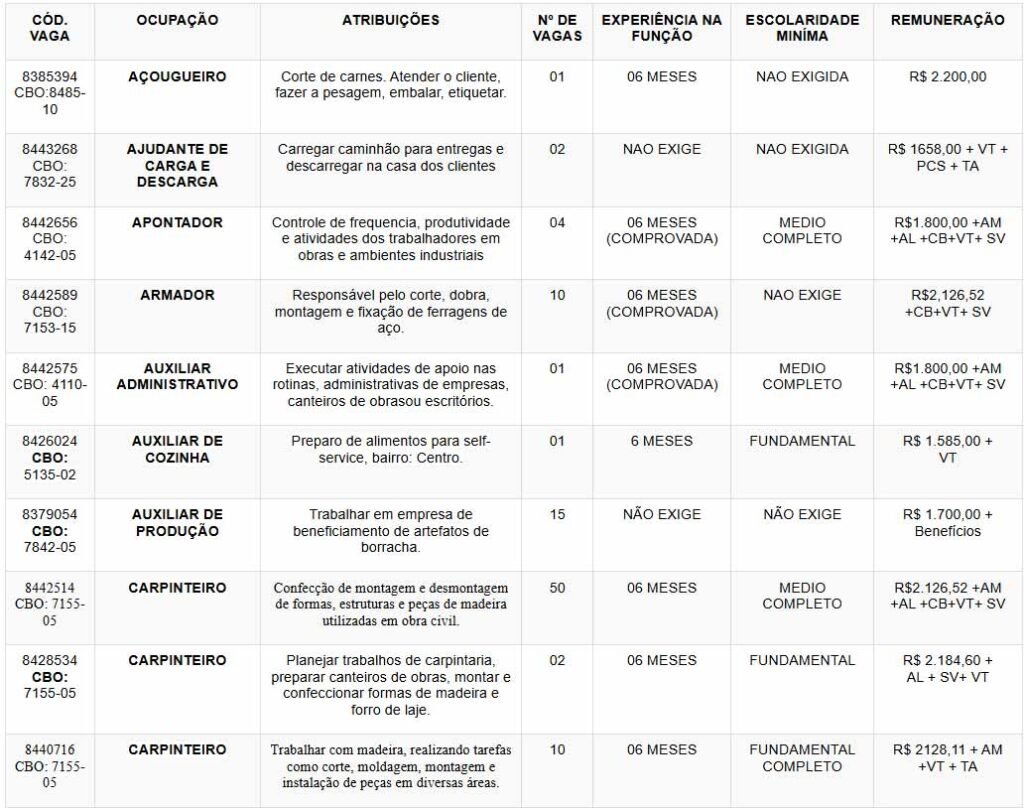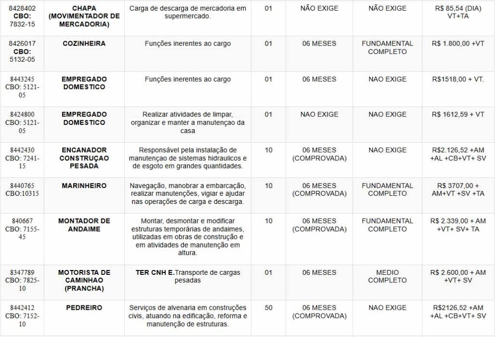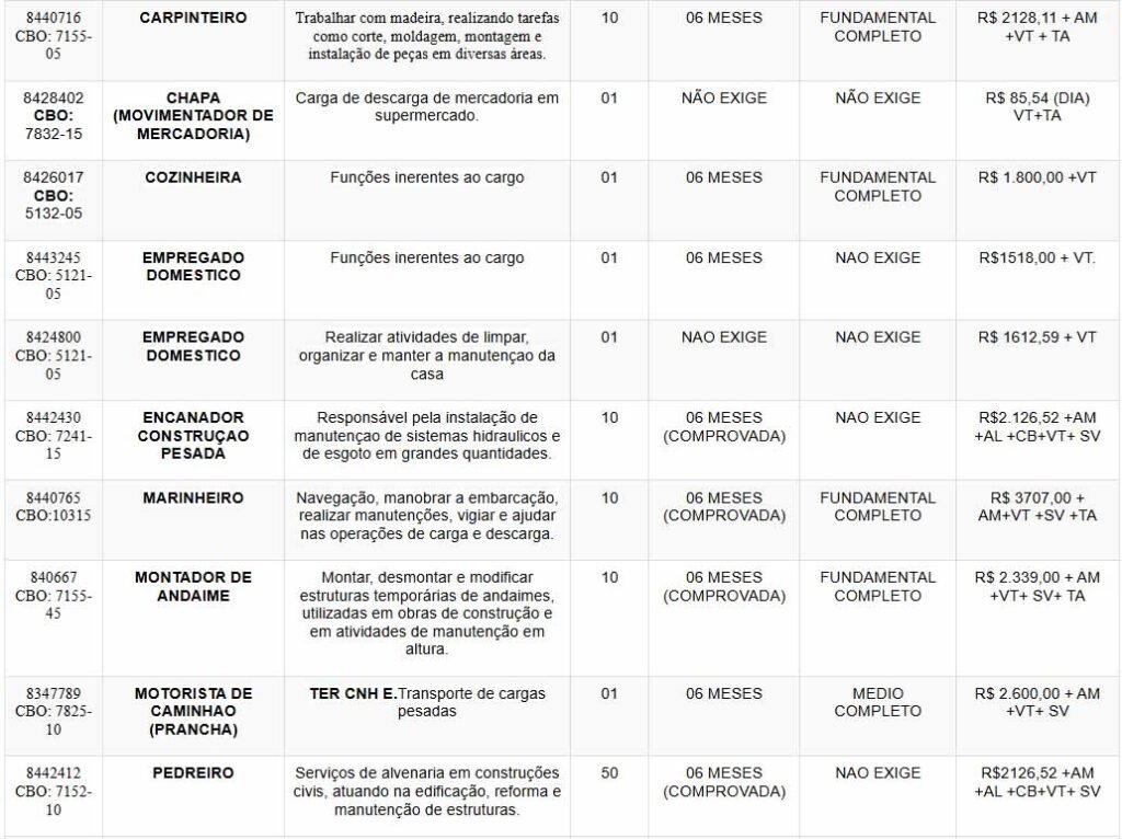 Entre as oportunidades destacam-se vagas para carpinteiro, servente de obras, pedreiro, auxiliar de produção, marinheiro e outras funções, esta última com remuneração de até R$ 3.707,00 e benefícios como assistência médica, vale-transporte e seguro de vida.