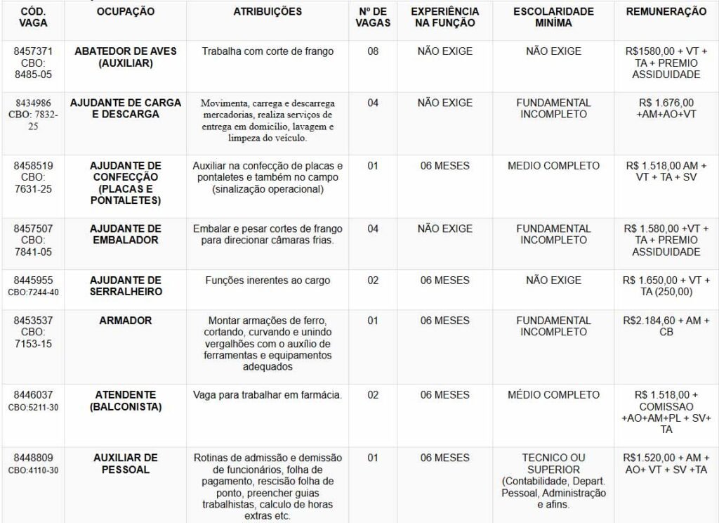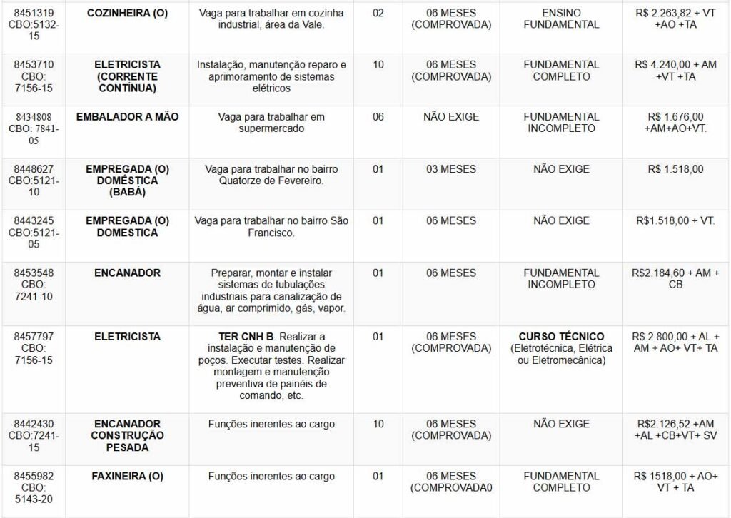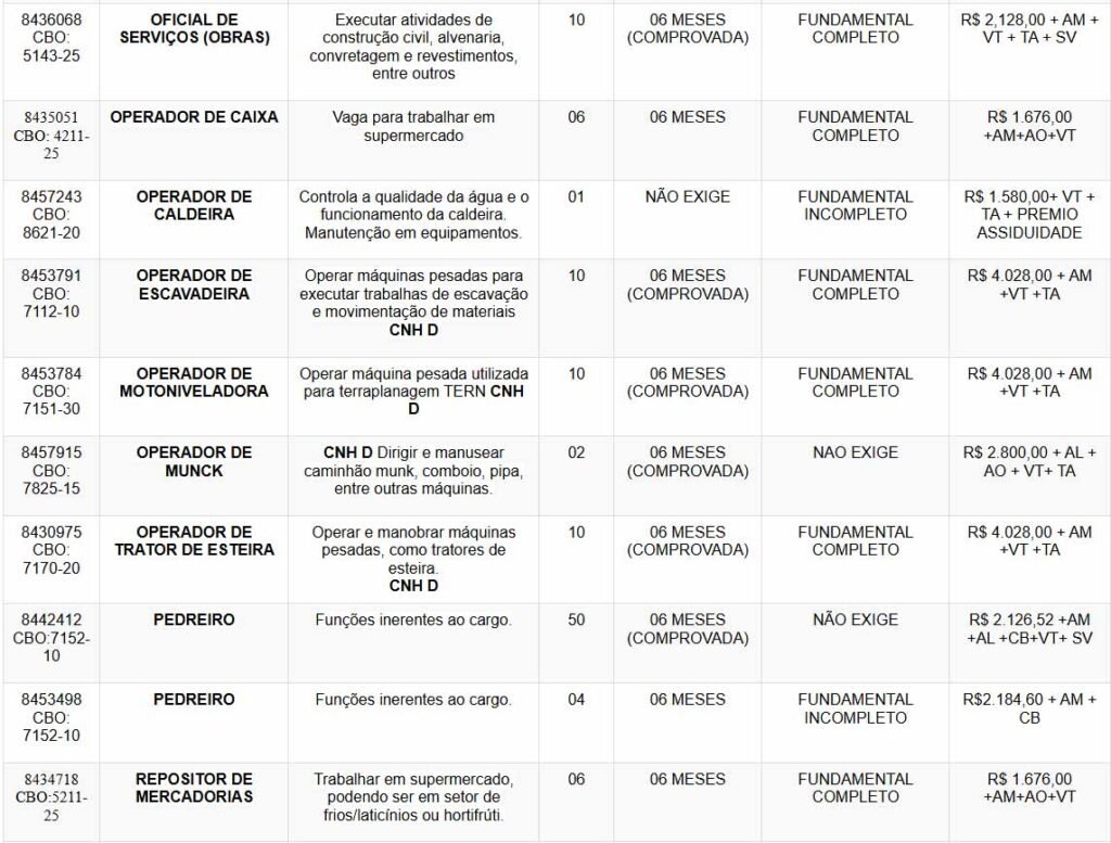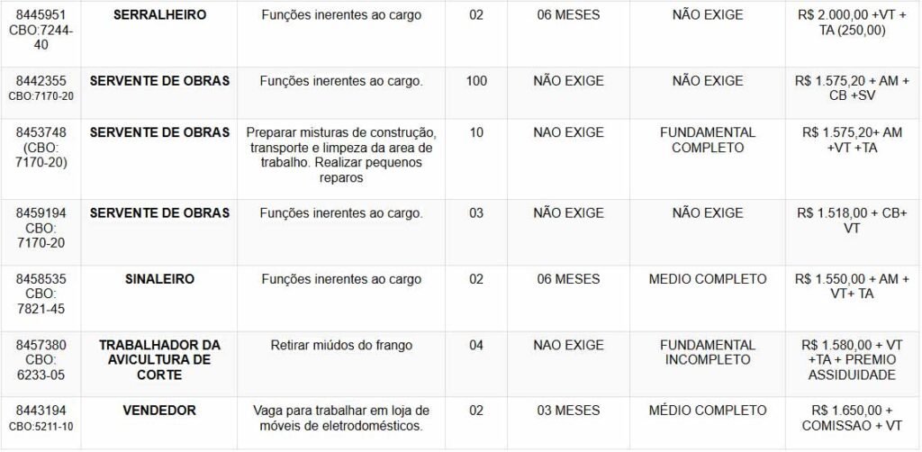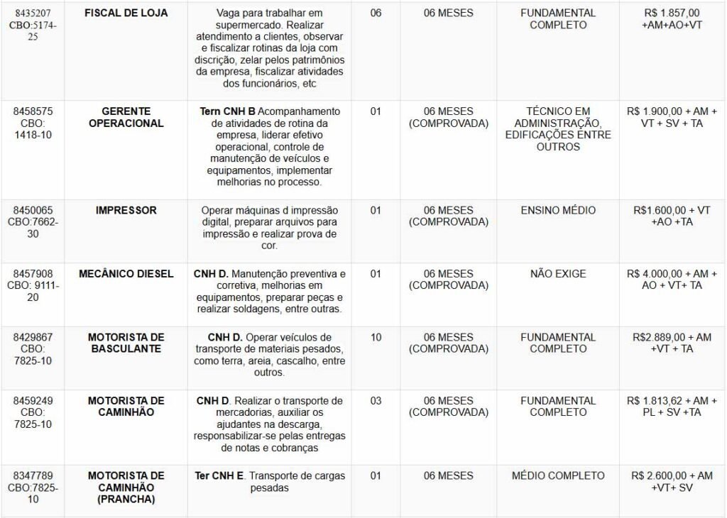 Essas vagas abrangem diversas áreas em Itabira, desde serviços gerais até funções técnicas e especializadas. Algumas exigem experiência comprovada, enquanto outras oferecem oportunidades para iniciantes. Os salários variam de acordo com a função, e algumas informações não foram divulgadas pelas empresas.