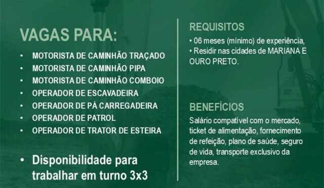 As vagas são destinadas a profissionais com experiência e residências nas cidades de Mariana ou Ouro Preto, com disponibilidade para atuar em turno 3×3. Confira os cargos ofertados: