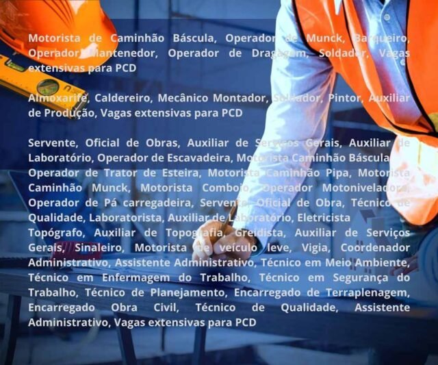 A Construtora Vale Verde, com atuação nacional nas áreas de pavimentação, dragagem, terraplenagem e obras civis industriais, está com vagas de emprego abertas em três cidades mineiras: Brumadinho, Itabira e Mariana. A empresa também atua com locação e operação de equipamentos anfíbios, além da fabricação de maquinário próprio.