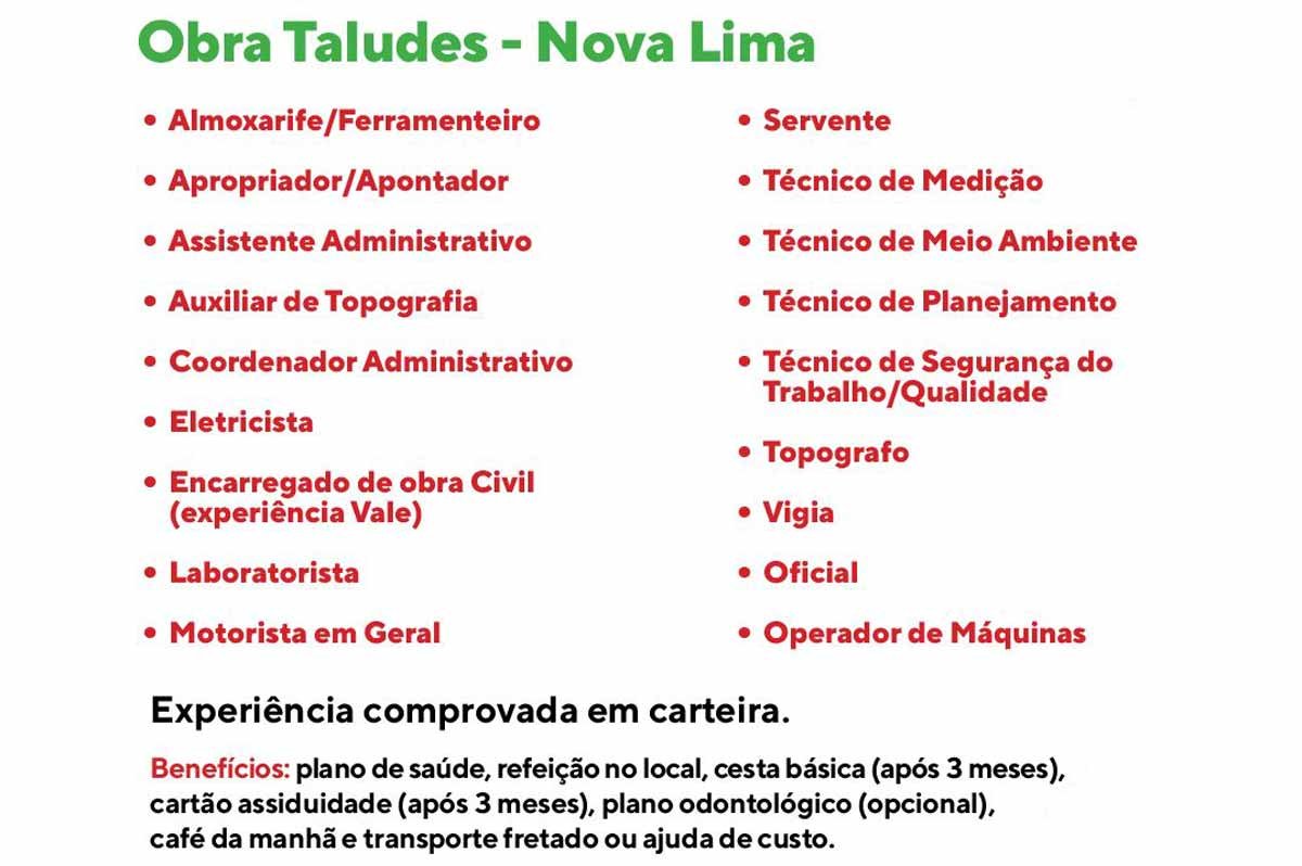 A obra de Taludes em Nova Lima, conduzida pela Coedra Construção e Dragagem, está com diversas vagas de emprego abertas em várias áreas, com oportunidades para profissionais com diferentes níveis de formação e experiência.