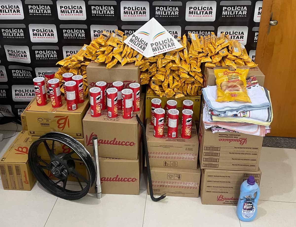 De acordo com os militares, foi recuperado o veículo, diversas caixas de Biscoito Bauducco e Batatas Pringles e apreendidos um celular, pé de cabra, uma roda de motocicleta e tecidos de cozinha.