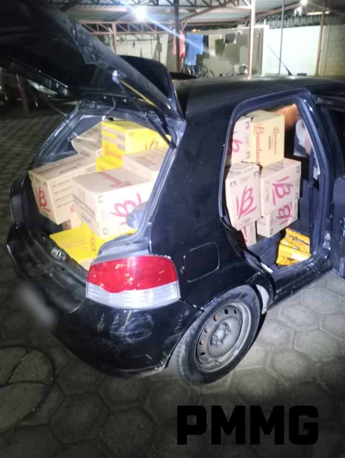 Os militares receberam informações sobre um veículo Fiat Palio, de cor preta, com placa de identificação adulterada, suspeito de envolvimento em furtos de carga na região. Diante das informações, foi realizado o monitoramento do automóvel, que foi interceptado na entrada da cidade na BR-381.