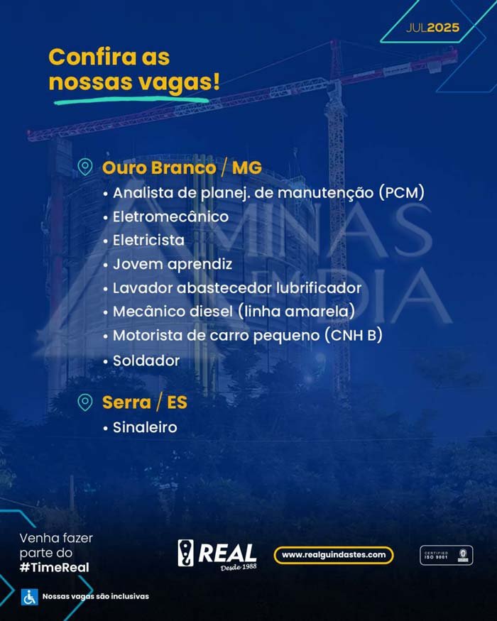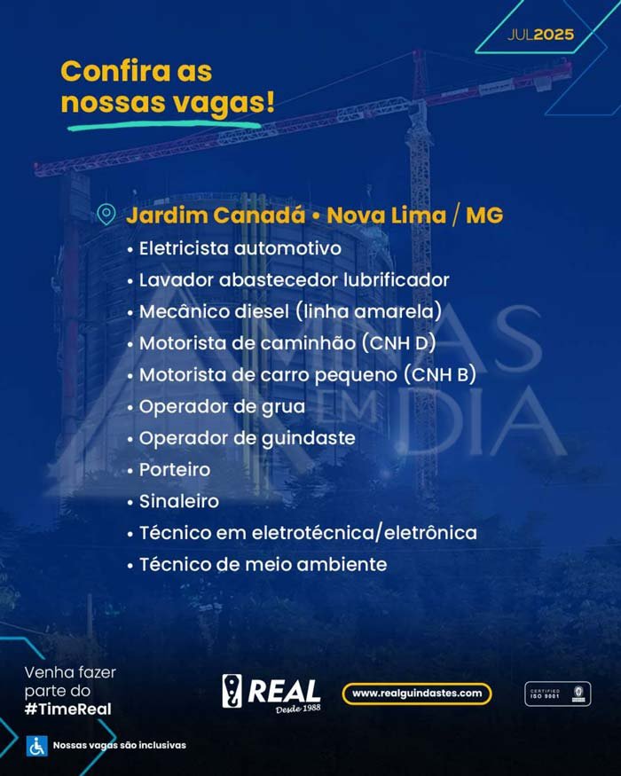 📩 Inscrições: os currículos devem ser enviados para curriculos@realguindastes.com, com o assunto indicando a cidade e a vaga de interesse, ou pelo WhatsApp (31) 99774-0947.