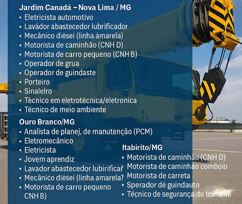 A companhia, que possui matriz em Nova Lima (MG) e bases de apoio em várias regiões, oferece oportunidades para diferentes funções, incluindo eletricista, mecânico diesel, operador de guindaste, motorista de caminhão, soldador, técnico em segurança do trabalho, entre outras.