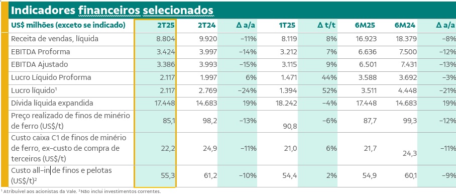 “Entregamos mais um trimestre sólido, refletindo nosso foco na excelência operacional e na disciplina de execução, seguindo no caminho certo para cumprir nossos guidances de 2025. Conforme avançamos na nossa estratégia de fortalecimento do nosso portfólio flexível de produtos, estamos entregando redução de custos ao mesmo tempo em que construímos uma maior resiliência, que nos ajudará a navegar bem em qualquer cenário de mercado. Essas conquistas reafirmam nossa estratégia e demonstram nosso compromisso em construir uma plataforma líder em mineração que gera valor de longo prazo para todos os nossos stakeholders”, afirma Gustavo Pimenta, presidente da Vale.