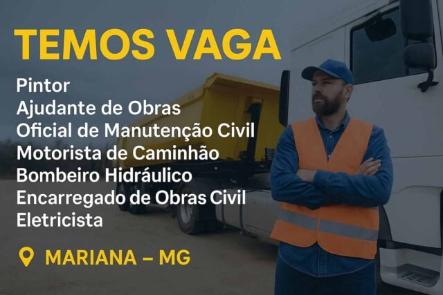 A Construtora Dinâmica anunciou a abertura de oito vagas de emprego em Mariana (MG), oferecendo oportunidades para diferentes áreas do setor da construção civil.
