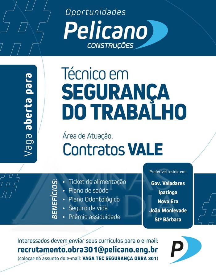 A Pelicano Construções está com vaga aberta para Técnico em Segurança do Trabalho, com atuação preferencial em contratos da Vale. A oportunidade é destinada a profissionais que residam nas regiões de Governador Valadares, Ipatinga, Nova Era, João Monlevade e Santa Bárbara.