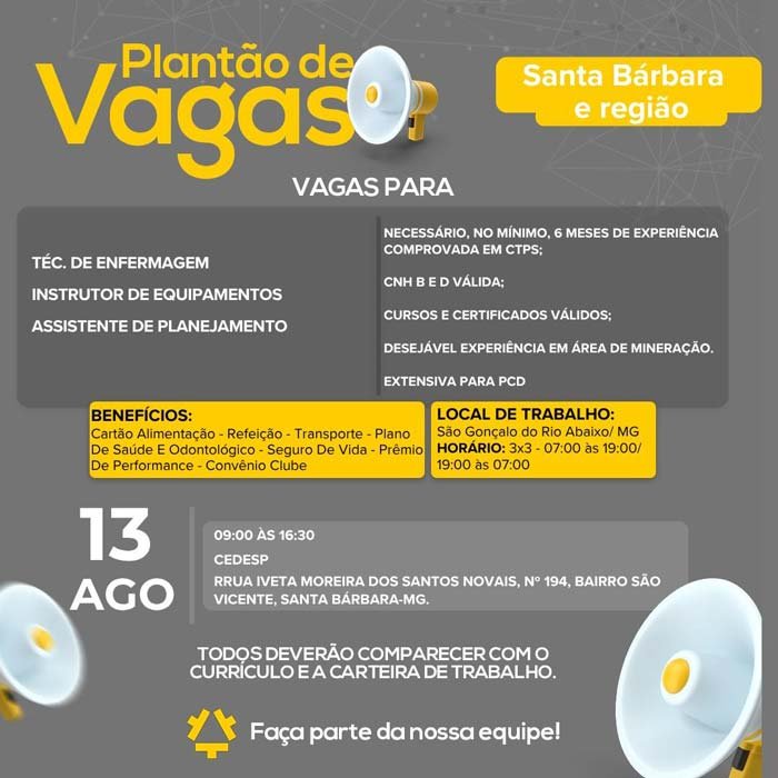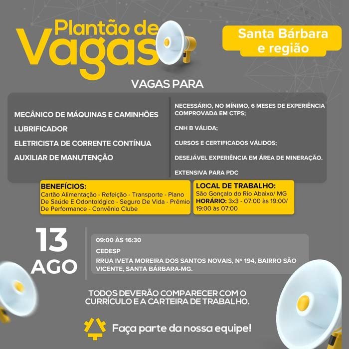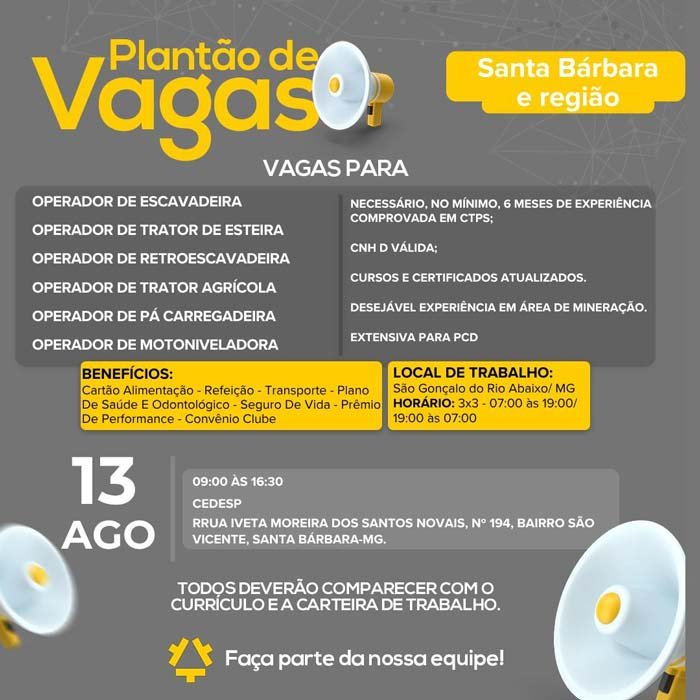 O município de Santa Bárbara (MG) e região receberá, no dia 13 de agosto, um plantão de vagas voltado para profissionais interessados em atuar no setor de mineração. As oportunidades são para candidatos com experiência comprovada e abrangem diferentes áreas operacionais, administrativas e de manutenção.