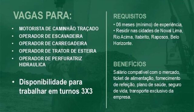Os candidatos devem ter mínimo de seis meses de experiência e residir em Nova Lima, Rio Acima, Itabirito, Raposos ou Belo Horizonte. Também é necessário ter disponibilidade para trabalhar em turnos 3×3.