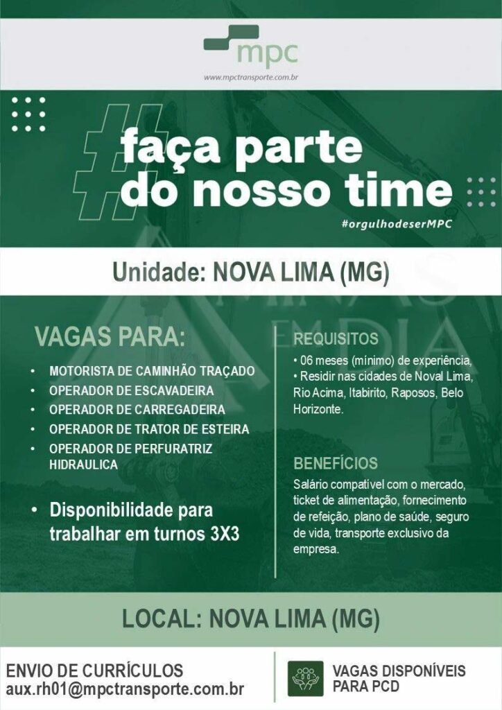 A MPC Transporte anunciou novas oportunidades de emprego para sua unidade em Nova Lima (MG). As vagas são para: