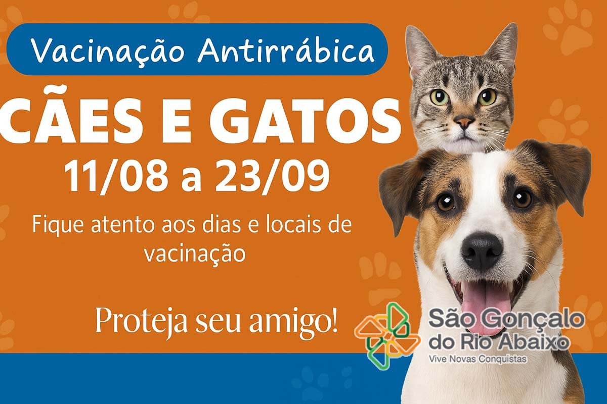A Prefeitura Municipal de São Gonçalo do Rio Abaixo, por meio da Secretaria de Saúde, deu início à campanha de vacinação antirrábica para cães e gatos, que acontece entre os dias 11 de agosto e 23 de setembro de 2025. A vacinação é gratuita e acontece em diversos bairros da cidade, incluindo atendimento casa a casa em algumas localidades.