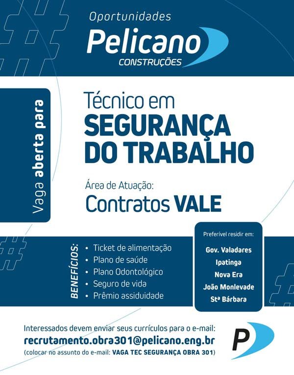 A Pelicano Construções está com vaga aberta para Técnico em Segurança do Trabalho, com atuação em contratos da Vale. A oportunidade é destinada a profissionais preferencialmente residentes em Ipatinga, Nova Era, João Monlevade, Governador Valadares e Santa Bárbara.