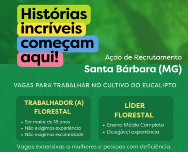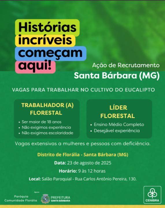 A CENIBRA está realizando uma ação de recrutamento no distrito de Florália, em Santa Bárbara (MG), oferecendo oportunidades de trabalho no cultivo do eucalipto. As vagas são destinadas tanto para Trabalhador(a) Florestal quanto para Líder Florestal, abrangendo diferentes perfis de candidatos.