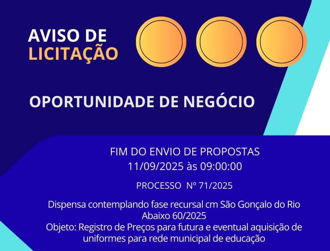 A Prefeitura Municipal de São Gonçalo do Rio Abaixo publicou o edital de licitação processo 71/2025, pregão eletrônico 60/2025, voltado para o registro de preços destinado à futura e eventual aquisição de uniformes para a rede municipal de educação.