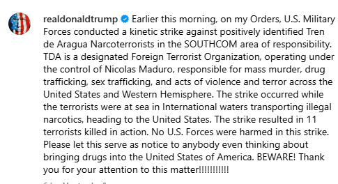 Segundo Trump, a ofensiva ocorreu em águas internacionais, na região de responsabilidade do Comando Sul (SOUTHCOM), quando os membros do grupo transportavam drogas em direção aos Estados Unidos. O ex-presidente destacou que a ação resultou em 11 mortos e que não houve baixas entre as tropas norte-americanas.