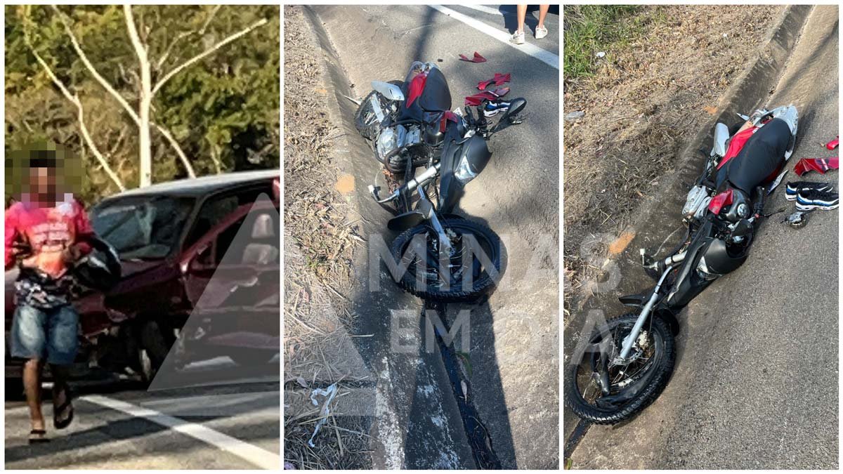A colisão envolveu uma motocicleta e um veículo de passeio. O condutor da moto, identificado pelas iniciais A.J.R.B., de 19 anos, sofreu ferimentos significativos, incluindo suspeita de fratura no fêmur e fratura exposta na mão.