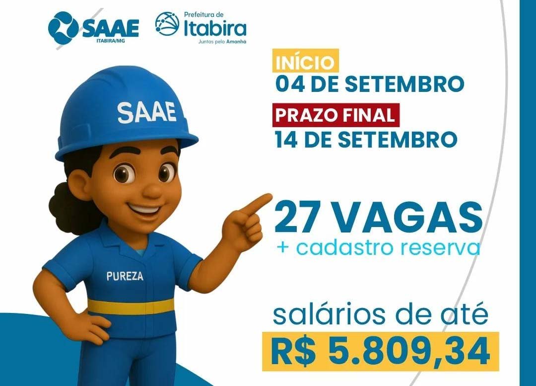 Estão abertas as inscrições para o Processo Seletivo Simplificado nº 001/2025 do Serviço Autônomo de Água e Esgoto (Saae) de Itabira, destinado à contratação temporária de profissionais para diversas funções. Ao todo, são oferecidas 27 vagas, além de cadastro reserva. Os salários variam de R$ 1.805,53 a R$ 5.809,34, conforme o cargo, e a carga horária mensal das vagas, que varia de 200 a 220 horas, com escala de trabalho.