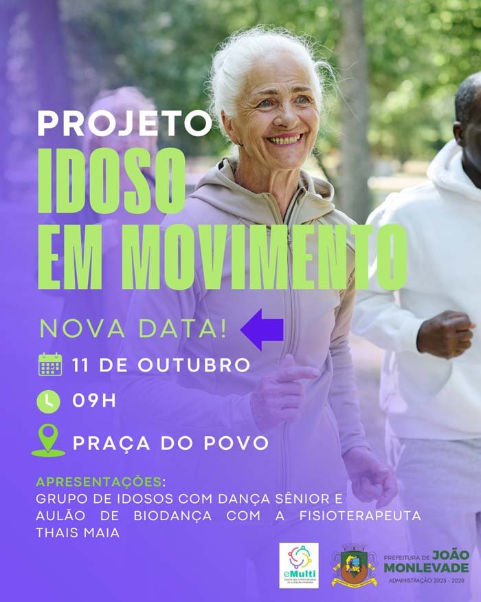 A Secretaria Municipal de Saúde de João Monlevade, por meio da Equipe E-Multi, promove na manhã do próximo sábado (11) o Projeto Idoso em Movimento, na Praça do Povo, em Carneirinhos. O evento celebra o Dia Nacional do Idoso, comemorado em 1º de Outubro.