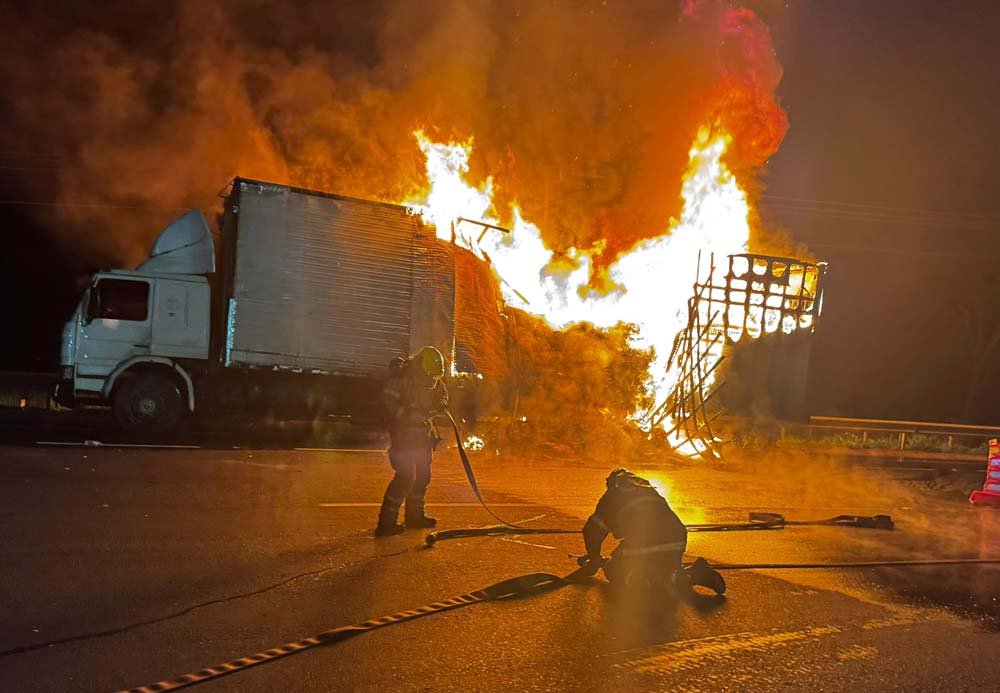 De acordo com as informações, o incêndio teria começado em uma das rodas de tração do veículo e rapidamente se espalhou para a carga, causando grandes labaredas e intensa fumaça na rodovia. A equipe da concessionária iniciou o combate ao fogo utilizando um caminhão-pipa, mas o volume de chamas exigiu apoio especializado.