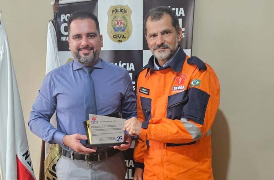 O Serviço Voluntário de Resgate (Sevor) realizou, nesta segunda-feira (10/11), uma visita ao delegado regional da Polícia Civil, Dr. Bernardo Barros Machado, para oficializar a entrega da placa de honra ao mérito destinada à corporação. A homenagem havia sido concedida durante uma cerimônia recente, mas o delegado não pôde comparecer ao evento.