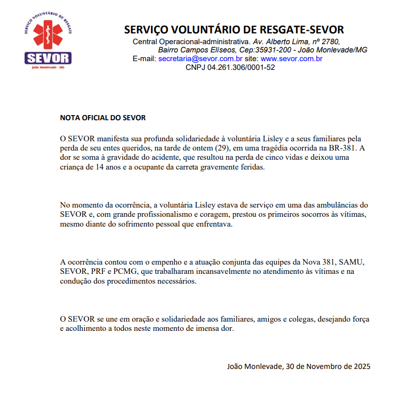 O Serviço Voluntário de Resgate (Sevor), de João Monlevade, divulgou na manhã deste domingo (30) uma nota oficial manifestando profunda solidariedade à voluntária Lisley, que perdeu familiares no grave acidente ocorrido na tarde de sábado (29) na BR-381. A tragédia resultou na morte de cinco pessoas e deixou duas vítimas gravemente feridas — uma adolescente de 14 anos e a ocupante da carreta envolvida no choque.