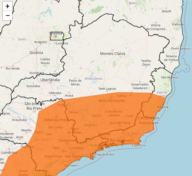 De acordo com o aviso, há previsão de chuva entre 30 e 60 mm/h ou 50 e 100 mm/dia, além de ventos intensos que podem variar entre 60 e 100 km/h, acompanhados de possível queda de granizo. Os riscos incluem corte de energia elétrica, danos em plantações, queda de árvores, destelhamentos e alagamentos.