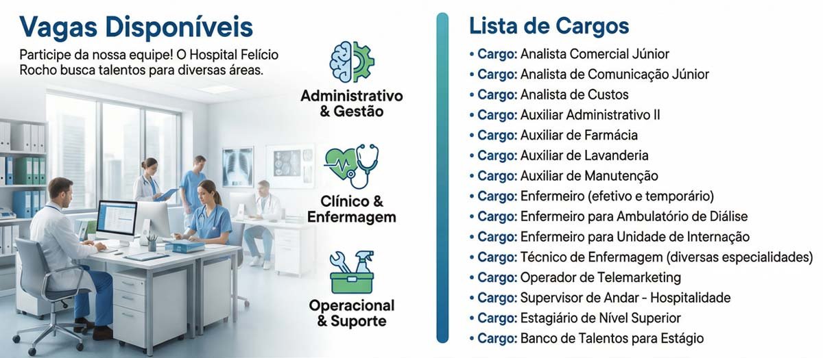 O Hospital Felício Rocho, uma das instituições de saúde mais tradicionais de Belo Horizonte, está com diversas vagas de emprego abertas para contratação imediata e formação de banco de talentos. As oportunidades são destinadas a profissionais de diferentes níveis de escolaridade e áreas de atuação, com contratos efetivos, temporários e de estágio