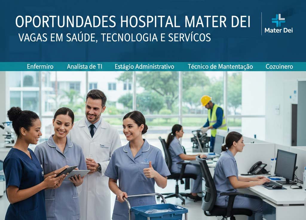 A Rede Mater Dei de Saúde está com um amplo processo seletivo aberto para suas unidades em Belo Horizonte e Nova Lima. As oportunidades contemplam diversas áreas, incluindo assistência hospitalar, administrativa, manutenção e hotelaria. Há vagas exclusivas para pessoas com deficiência (PCD) e chances para quem busca o primeiro seguro de vida profissional por meio de estágios.