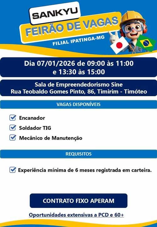 A multinacional de origem japonesa Sankyu S.A., por meio de sua filial em Ipatinga, anunciou a realização de um Feirão de Vagas nesta quarta-feira, 07 de janeiro de 2026. O evento busca contratar profissionais qualificados para atuar em contrato fixo na planta da Aperam, em Timóteo.
