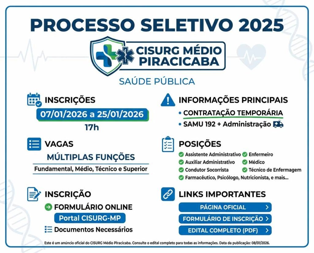 O Consórcio Público Intermunicipal de Saúde para Gerenciamento dos Serviços de Urgência e Emergência da Região do Médio Piracicaba (CISURG Médio Piracicaba) anunciou a abertura das inscrições para o 1º Processo Seletivo Simplificado de 2025, destinado à contratação temporária de profissionais para atuação no SAMU 192 Regional e na estrutura administrativa do consórcio.