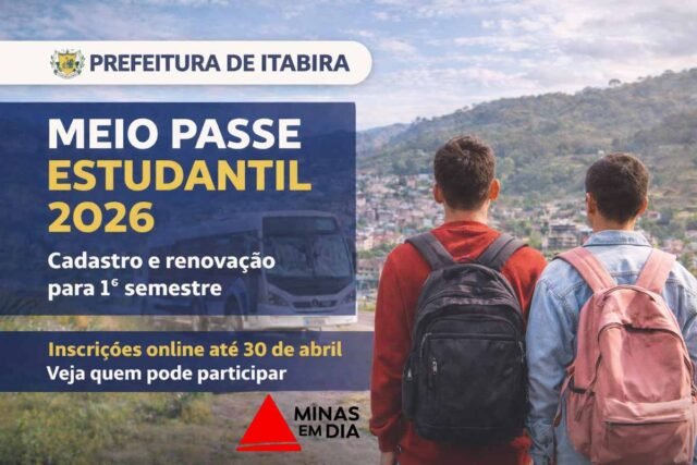 A Prefeitura Municipal de Itabira, por meio da Secretaria Municipal de Educação (SME), informou desde o dia 15 de janeiro de 2026, o período de cadastro e renovação do benefício de Meio Passe Estudantil, referente ao 1º semestre do ano letivo de 2026.