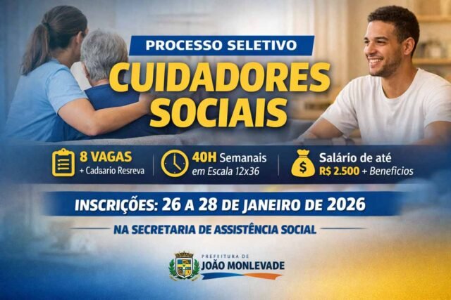 A Prefeitura de João Monlevade, por meio da Secretaria de Assistência Social, publicou o Edital nº 01/2026, que abre inscrições para o Processo Seletivo Público Simplificado destinado à contratação temporária de Cuidadores Sociais. O certame visa o preenchimento de oito vagas para formação de cadastro reserva, para atuação na Unidade de Acolhimento Institucional – Residência Inclusiva.