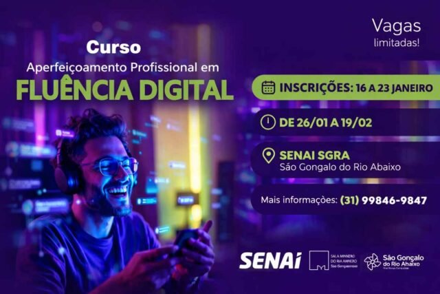 A Prefeitura de São Gonçalo do Rio Abaixo, em parceria com o SENAI e a Sala Mineira do Empreendedor, anunciou a abertura das inscrições para o curso de Aperfeiçoamento Profissional em Fluência Digital. A iniciativa visa capacitar cidadãos para as novas demandas do mercado de trabalho tecnológico.