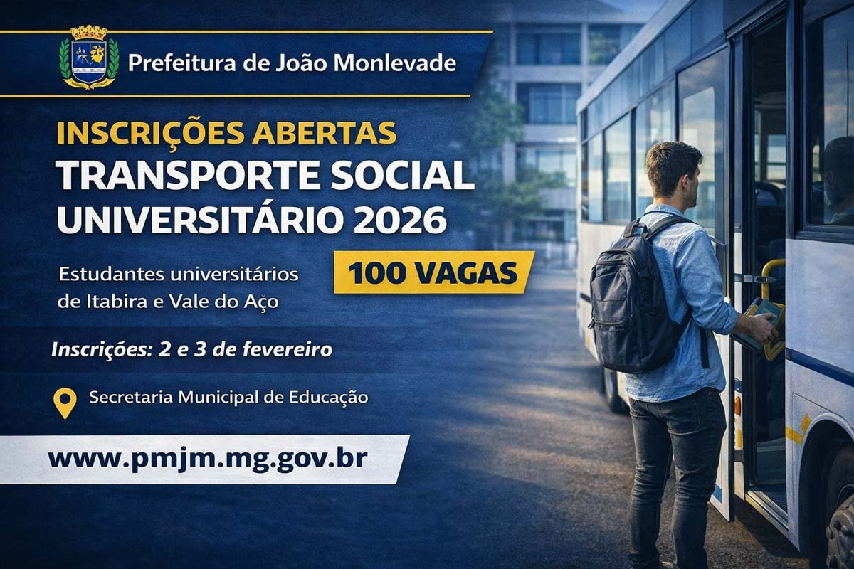 A Prefeitura de João Monlevade, por meio da Secretaria Municipal de Educação, abriu as inscrições para o Processo Seletivo Público Simplificado do Programa de Transporte Social Universitário, que oferece 100 vagas para estudantes do ensino superior no ano letivo de 2026.
