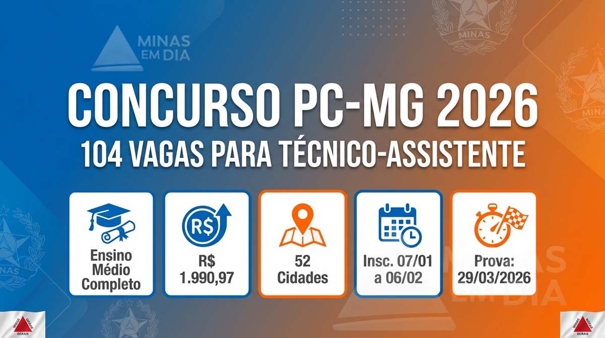 A Polícia Civil de Minas Gerais (PC-MG) oficializou a abertura de um novo concurso público destinado ao preenchimento de 104 vagas para o cargo de Técnico-Assistente da Polícia Civil e de Atividades Governamentais (TPAG). A seleção é voltada especificamente para a área de conhecimento de Auxiliar de Perícia, carreira que exige apenas o ensino médio completo como requisito de escolaridade.