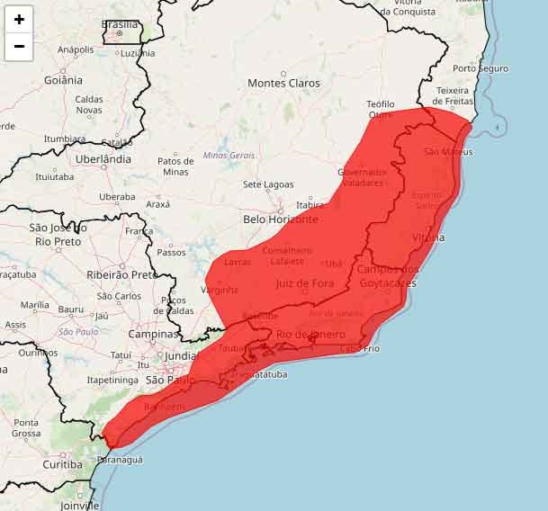 Além de Minas Gerais, o sistema de baixa pressão afeta áreas limítrofes no Espírito Santo, Rio de Janeiro e São Paulo.