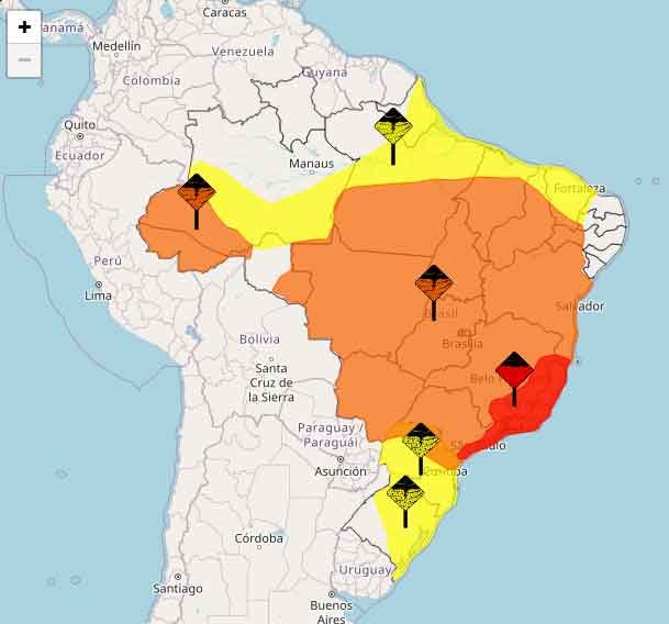 Segundo o órgão, a previsão é de chuvas intensas com volume superior a 60 mm/h ou acumulados que podem ultrapassar os 100 mm em um único dia. O cenário meteorológico impõe um risco elevado para transbordamento de rios, grandes alagamentos e deslizamentos de encostas em áreas vulneráveis.