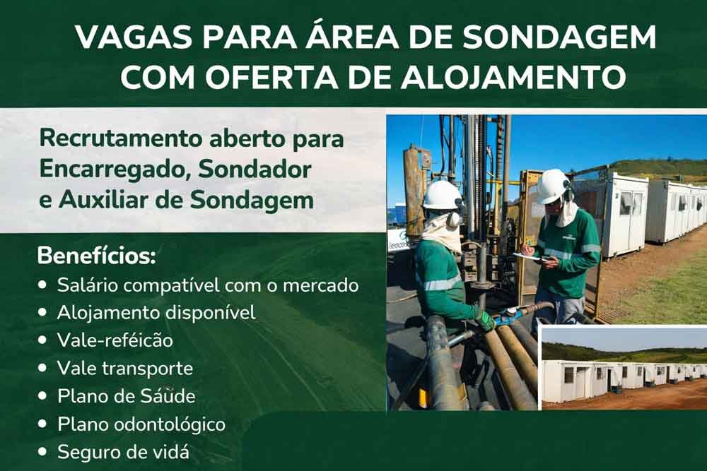 A Geocontrole está com vagas abertas para profissionais interessados em atuar na área de sondagem. As oportunidades são para diferentes níveis de experiência e exigem disponibilidade para trabalhar em diversos locais do país.