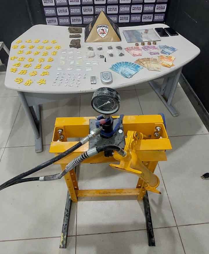 Durante buscas no imóvel, os policiais apreenderam porções de entorpecentes variados, uma balança de precisão, uma prensa hidráulica, dinheiro em espécie, celulares e um caderno de contabilidade do tráfico, contendo registros de interesse investigativo.