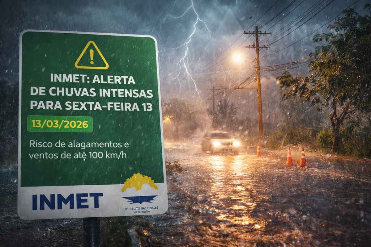 O Instituto Nacional de Meteorologia (INMET) emitiu um alerta de perigo para chuvas intensas válido durante toda esta sexta-feira, 13 de março de 2026. O aviso começou à 0h01 e segue até 23h59, com previsão de tempestades em diversas regiões do país.