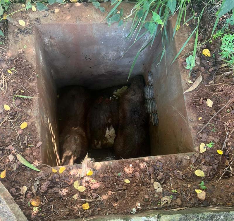 Durante a avaliação da situação, foi verificado que um dos animais já se encontrava morto, apresentando elevado estado de putrefação, possivelmente em razão do tempo em que permaneceu no interior da estrutura. Os outros dois animais, entretanto, ainda estavam vivos, embora bastante debilitados em função das circunstâncias em que se encontravam.