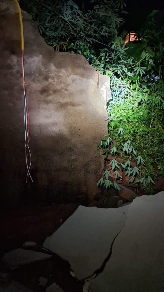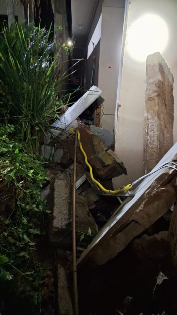 De acordo com as informações repassadas, o chamado foi registrado por volta das 23h25. Ao chegarem ao local, os bombeiros constataram que parte do muro lateral de uma residência havia cedido, em decorrência do acúmulo de água da chuva. A falta de escoamento adequado provocou pressão excessiva na estrutura, resultando no desabamento.