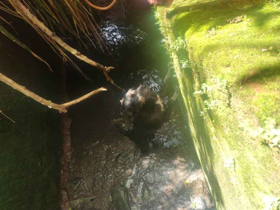 Ao chegarem ao local, os militares adentraram a vegetação e localizaram o animal dentro da estrutura, a aproximadamente três metros de profundidade. Durante a tentativa de resgate, o cão, bastante agitado, se deslocou pela canaleta, descendo ainda mais pela estrutura.