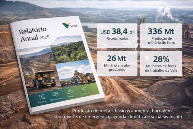 A Vale publicou seu Relatório Anual 2025, documento que reúne, de forma integrada, as informações financeiras, operacionais, ambientais, sociais e de governança da companhia referentes ao período de 1º de janeiro a 31 de dezembro de 2025. O relatório reflete a evolução do antigo Relato Integrado e reforça uma visão única de desempenho, gestão de riscos e criação de valor no longo prazo, conectando resultados econômicos a temas como segurança, clima, pessoas e relacionamento com a sociedade.