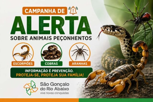 A Prefeitura de São Gonçalo do Rio Abaixo, por meio da Gerência Regional de Saúde de Itabira, está alertando a população sobre os riscos de acidentes com animais peçonhentos. A campanha educativa traz informações essenciais sobre como evitar encontros com escorpiões, cobras e aranhas, além de orientações cruciais sobre o que fazer em caso de acidente.